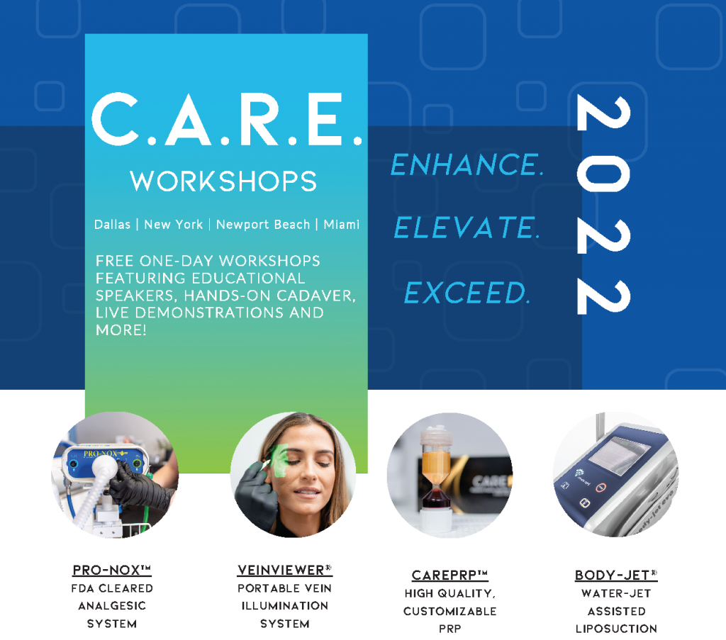 If you are looking to set your practice apart in 2022, look no further than the upcoming CAREstream Academy of Rejuvenating Education (C.A.R.E.) symposiums for aesthetic and regenerative providers. This FREE, one-day workshop features educational speakers, hands-on cadaver training for water-jet assisted lipo harvest (body contouring), and live demonstrations with CAREprp, VeinViewer HD imaging and Pro-Nox Nitrous Oxide/Oxygen Gas Delivery System. More details to come!